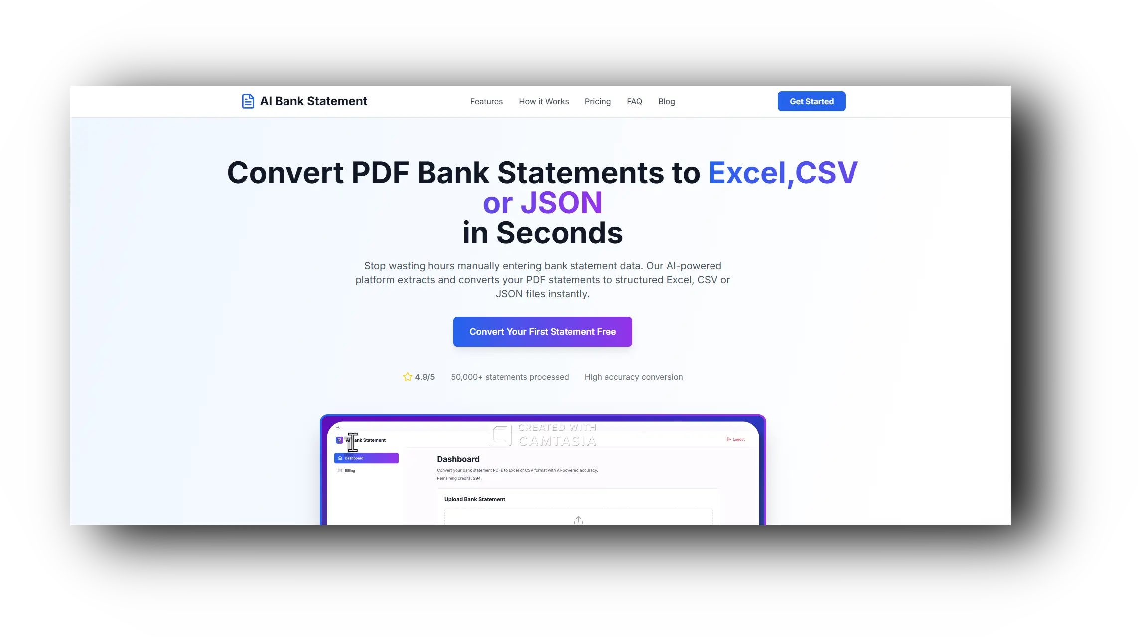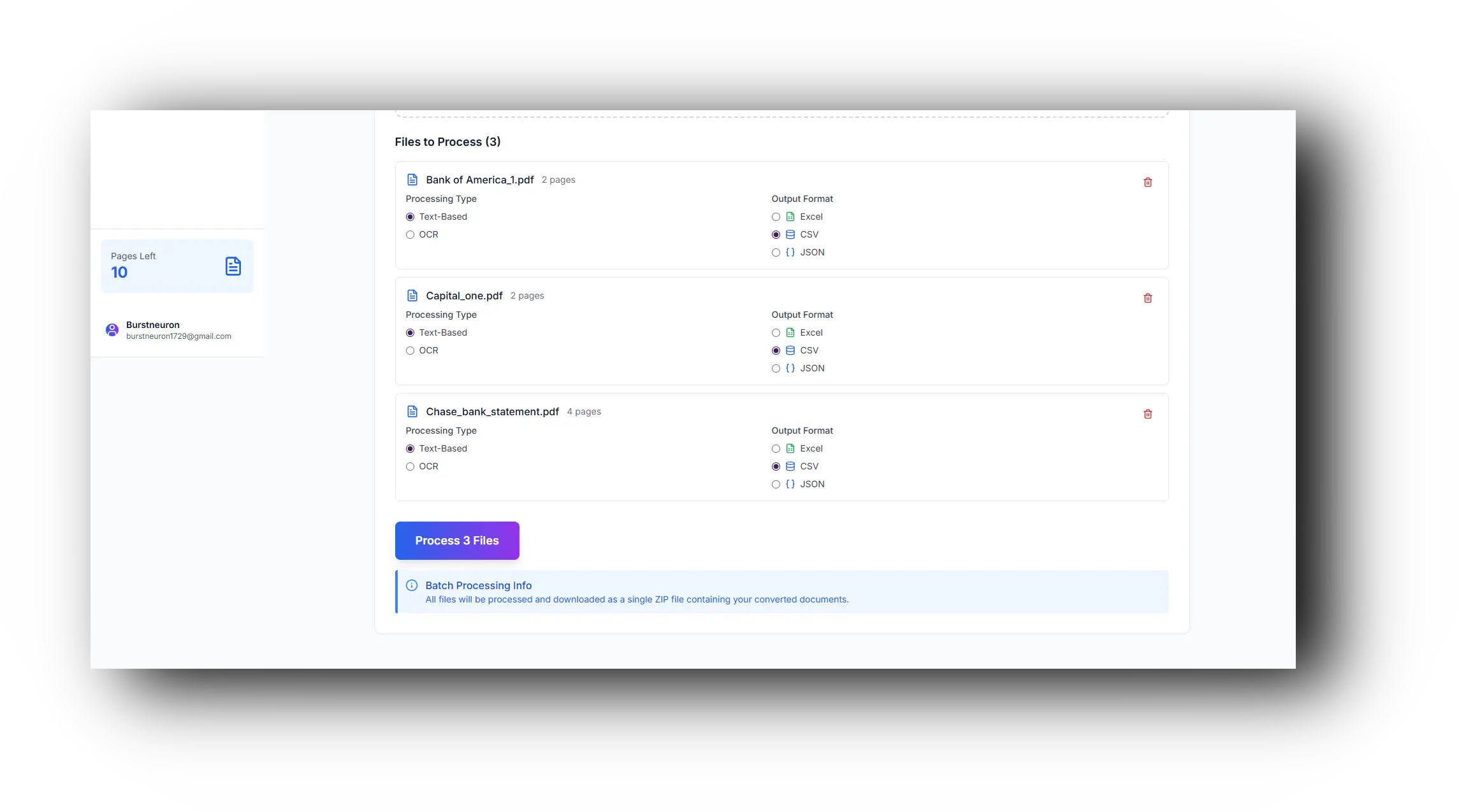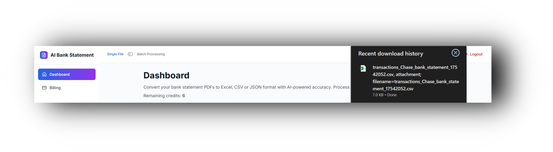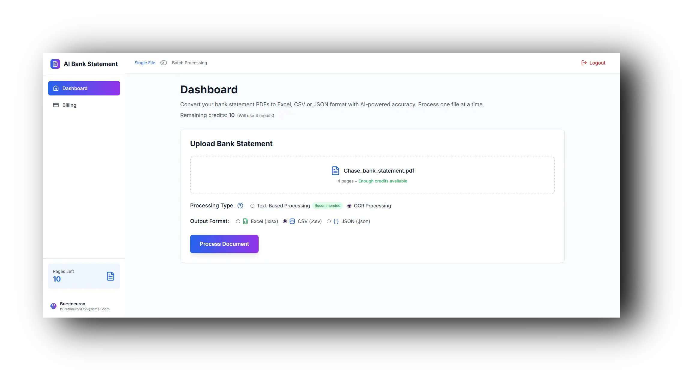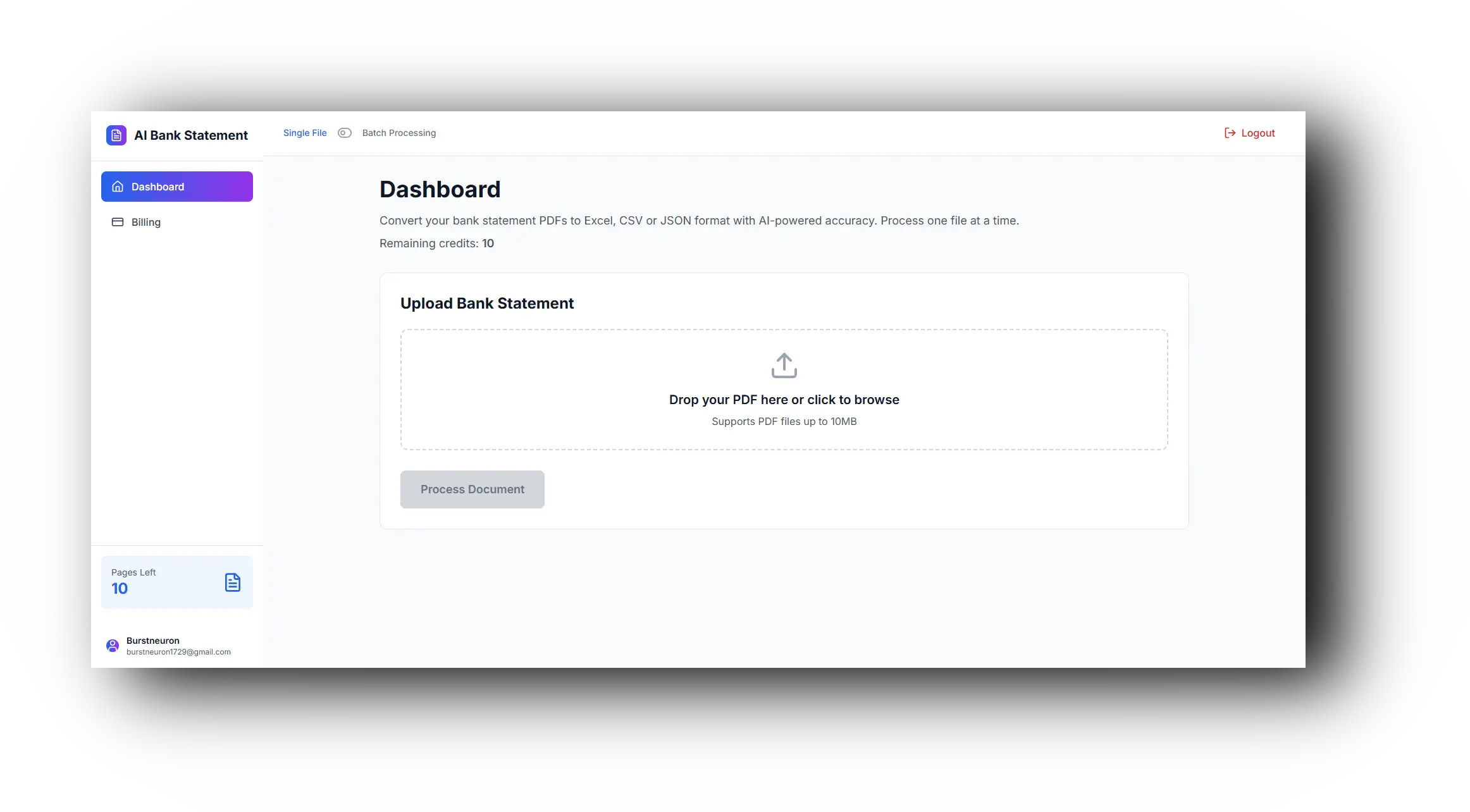 Login (you get 10 credits free), upload the document. In the dashboard, you select either single-file processing or batch processing of bank statements at a time.